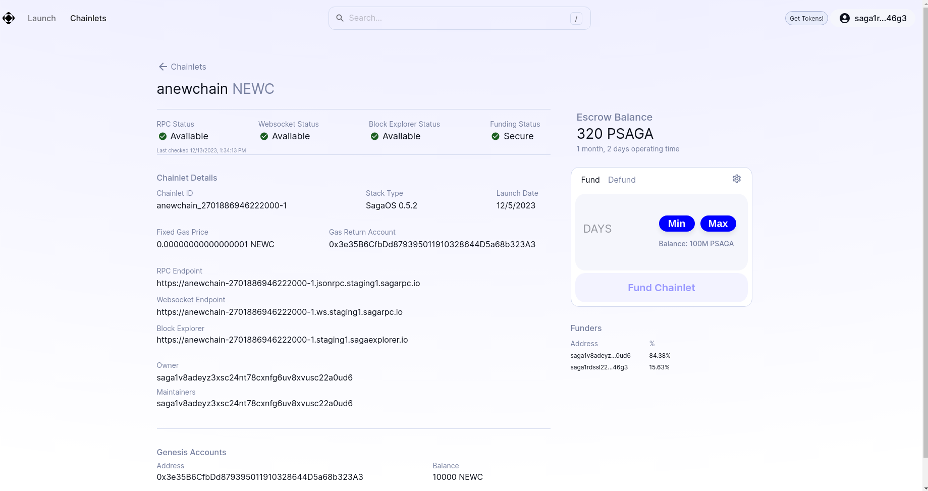 In the example displayed above, we have selected a chainlet called `anewchain`. You can see it's escrow account balance and also view the funders of this chainlet under the `Funders` section.